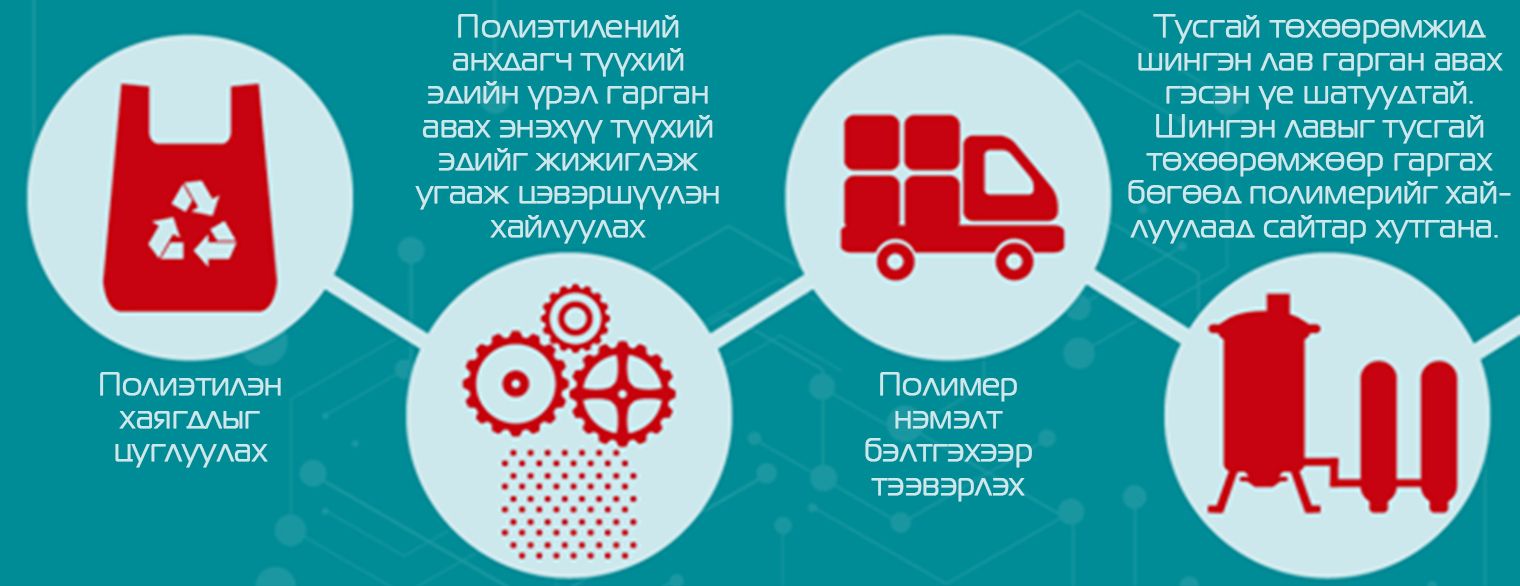 Полиэтилэн хаягдлыг цуглуулах, полиэтилений анхдагч түүхий эдийн үрэл гарган авах энэхүү түүхий эдийг жижиглэж угааж цэвэршүүлэн хайлуулах, полимер нэмэлт бэлтгэхээр тээвэрлэх, тусгай төхөөрөмжид шингэн лав гарган авах гэсэн үе шатуудтай.